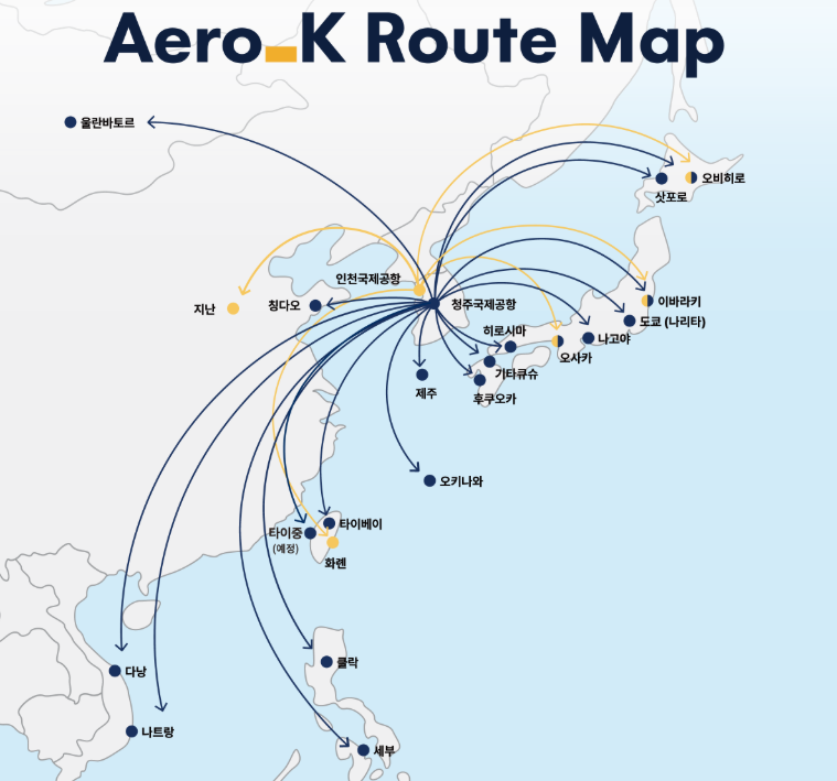 청주국제공항을 거점으로 시작한 에어로케이는 폭발적인 수요 증가에 힘입어 일본, 대만, 동남아 등 핵심 여행지로 노선을 넓혔으며, 최근에는 인천국제공항까지 진출했습니다.