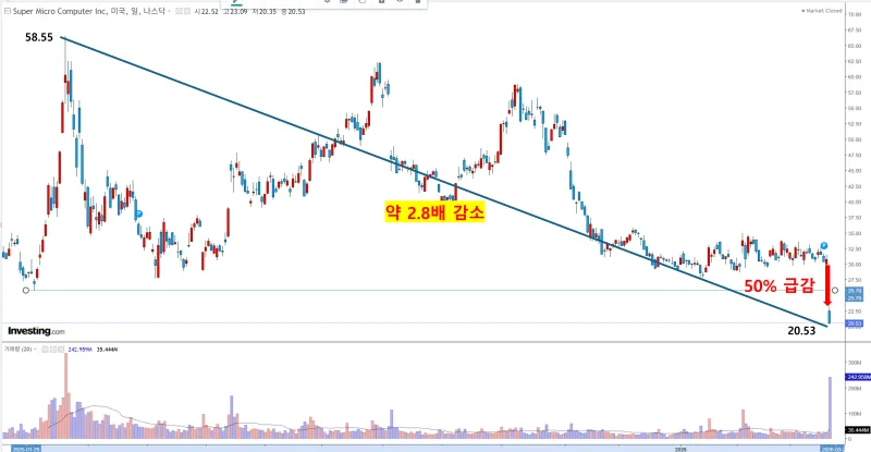 최근 슈퍼마이크로컴퓨터는 과거 회계 부정 의혹을 넘어, 공동 창업자가 포함된 경영진의 미국 수출 통제 위반 혐의라는 사법적 리스크에 직면하며 시장의 신뢰를 잃고 있습니다. 2026년 3월 19일 미 법무부가 발표한 기소장에 따르면, 금지된 AI 칩을 우회 수출했다는 혐의가 구체화되면서 주가가 하루 만에 30% 넘게 폭락하는 사태가 벌어졌습니다.