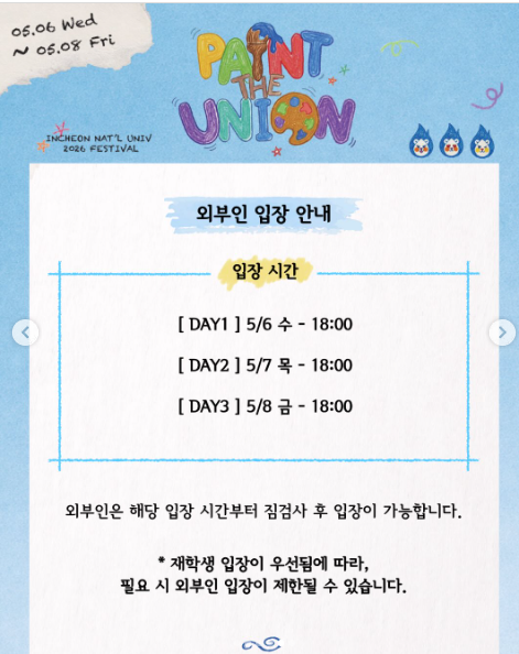 인천대학교 대동제 'PAINT THE UNION'은 5월 6일부터 8일까지 송도캠퍼스 잔디구장에서 개최됩니다. 💰 DAY1(6일)에는 위너·식케이·하온이 힙합 나이트를 장식하고, DAY2(7일)에는 체리필터·프로미스나인·아이칠린이 밴드와 걸그룹의 조화를 선보입니다. 그리고 피날레인 DAY3(8일)에는 헤드라이너 라이즈가 무대에 오르며 3일간의 대장정을 마무리합니다. 3일 모두 개성 있는 테마로 꾸려져 하루만 가도 충분히 만족스러운 구성입니다.