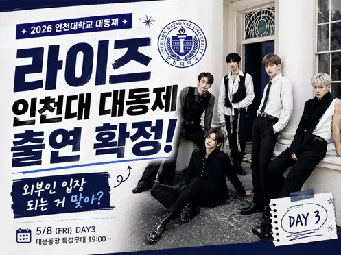 2026년 5월 대학 축제 시즌, 단연 가장 뜨거운 화제는 라이즈(RIIZE)의 인천대 대동제 출연 확정 소식입니다. 이미 팬덤 사이에서 "역대급 라인업"이라는 평가가 쏟아지고 있고, 외부인도 입장 가능하다는 사실이 알려지며 비재학생들의 관심까지 폭발하고 있습니다. 라이즈가 어떤 그룹인지, 공연은 언제 어디서 열리는지, 외부인 입장은 어떻게 하는지 지금 바로 정리해 드리겠습니다.